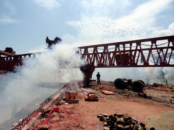 上午10点30分,项目办、高驻办等相关领导,在公司总经理助理丁世国、项目经理罗权等的陪同下,亲临我盘石分离立交梁板安装施工现场指导安装工作。10点40分,架梁工作正式开始,现场顿时鞭炮齐鸣、礼花绽放。 10点58分,首片梁板顺利安装。