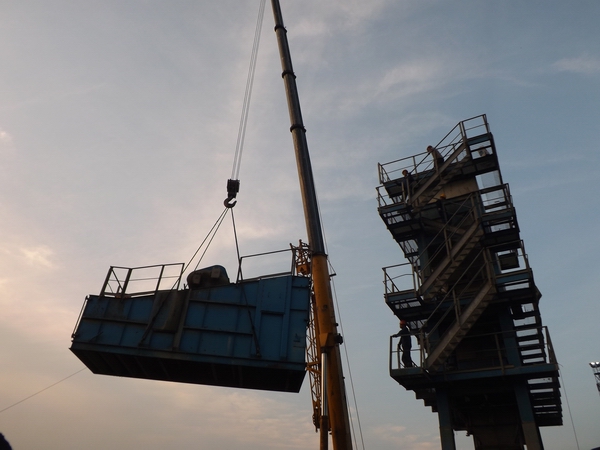 G205改建路面项目完成拌和站主楼吊装 发布时间:2013年07月19日 来源:G205改建路面项目 发布人: 作者:杨艳峰 浏览:2771次 7月17日下午3时,伴随着响声震天的鞭炮声,两辆大型吊车在安全技术人员和作业人员的通力协作下,安全有序地进行拌和站主楼的吊装。经过全体施工人员的努力,于当日下午6时30分完成拌和站主楼的吊装。